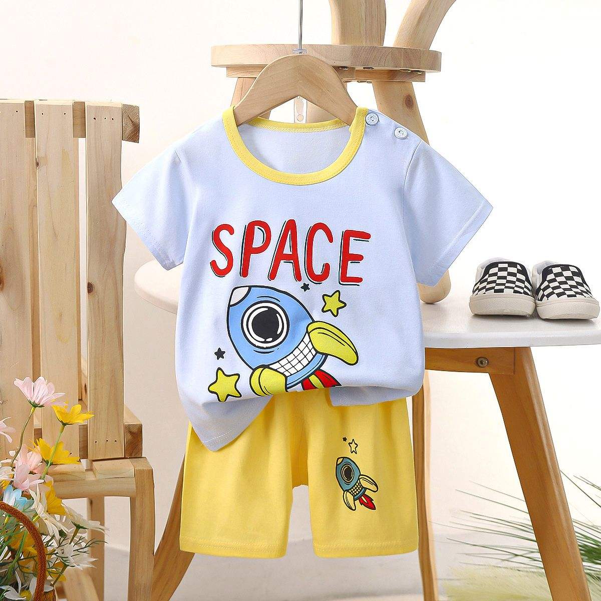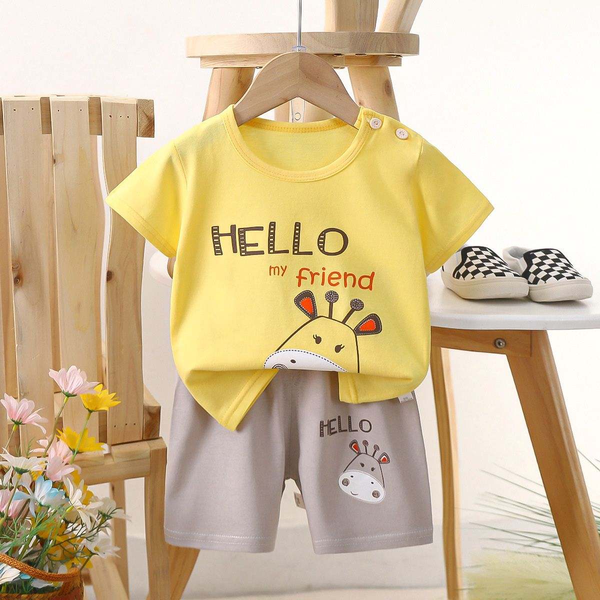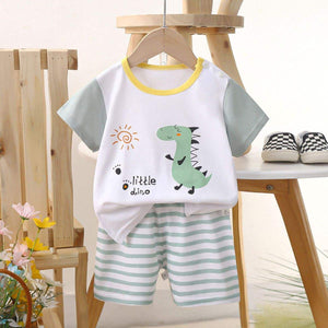 Made from soft, breathable cotton ideal for warm weather, these adorable printed sets include a comfy short-sleeve tee with snap buttons on the shoulder and matching elastic-waist shorts.