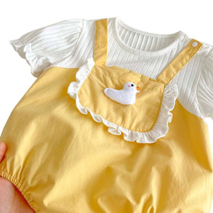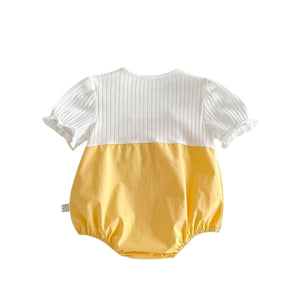 The Feather & Fawn SunnyQuack Layered Romper combines the sweetness of a summer pinafore with the comfort of a one-piece. Featuring a ribbed white top seamlessly attached to a soft yellow romper bottom, this outfit creates an adorable layered look without the fuss of coordinating separates.
