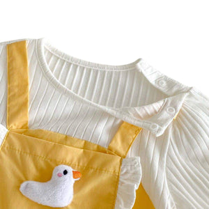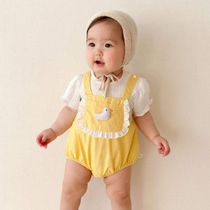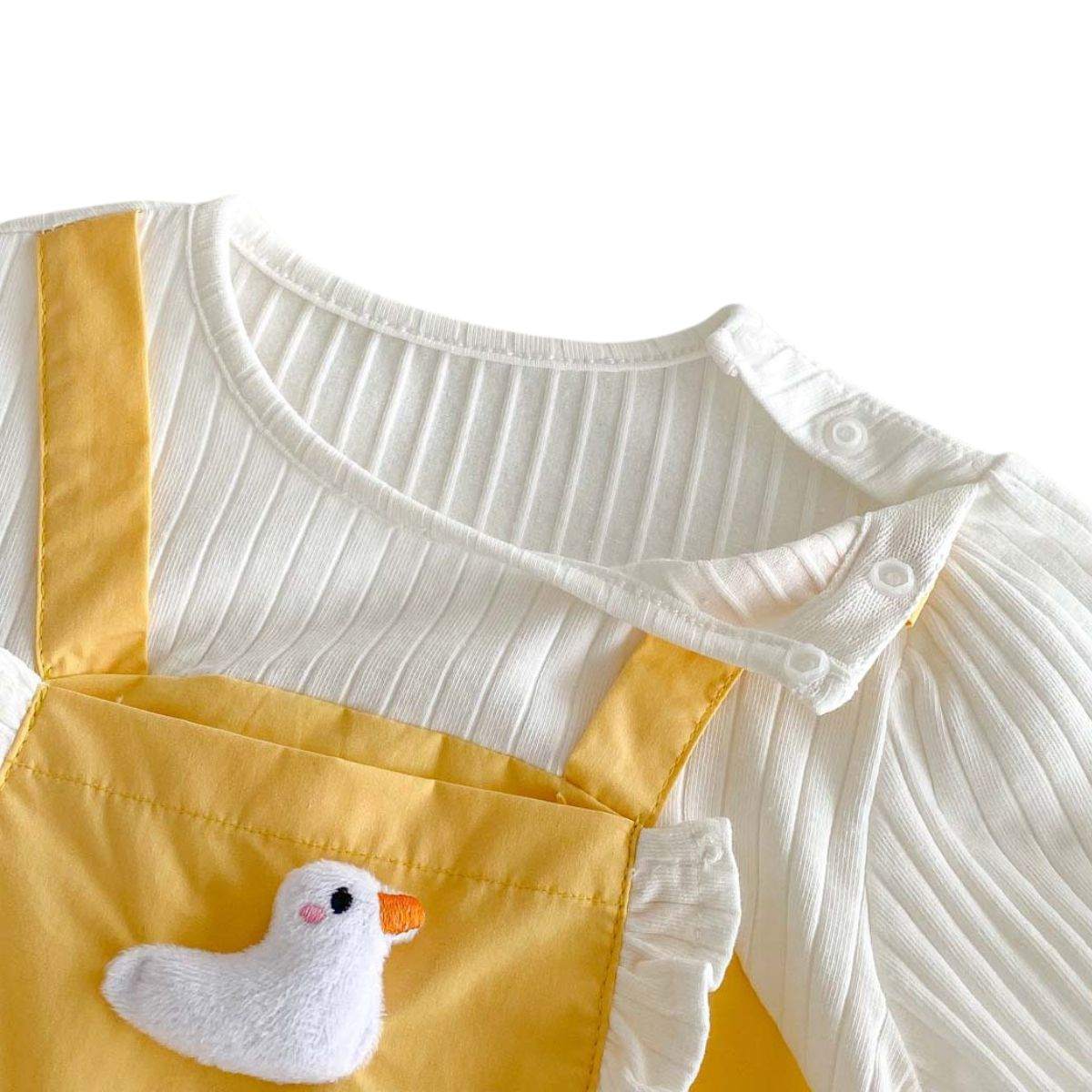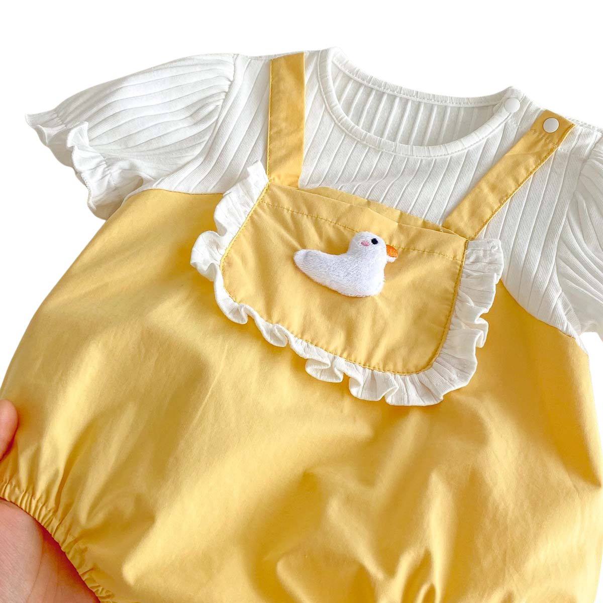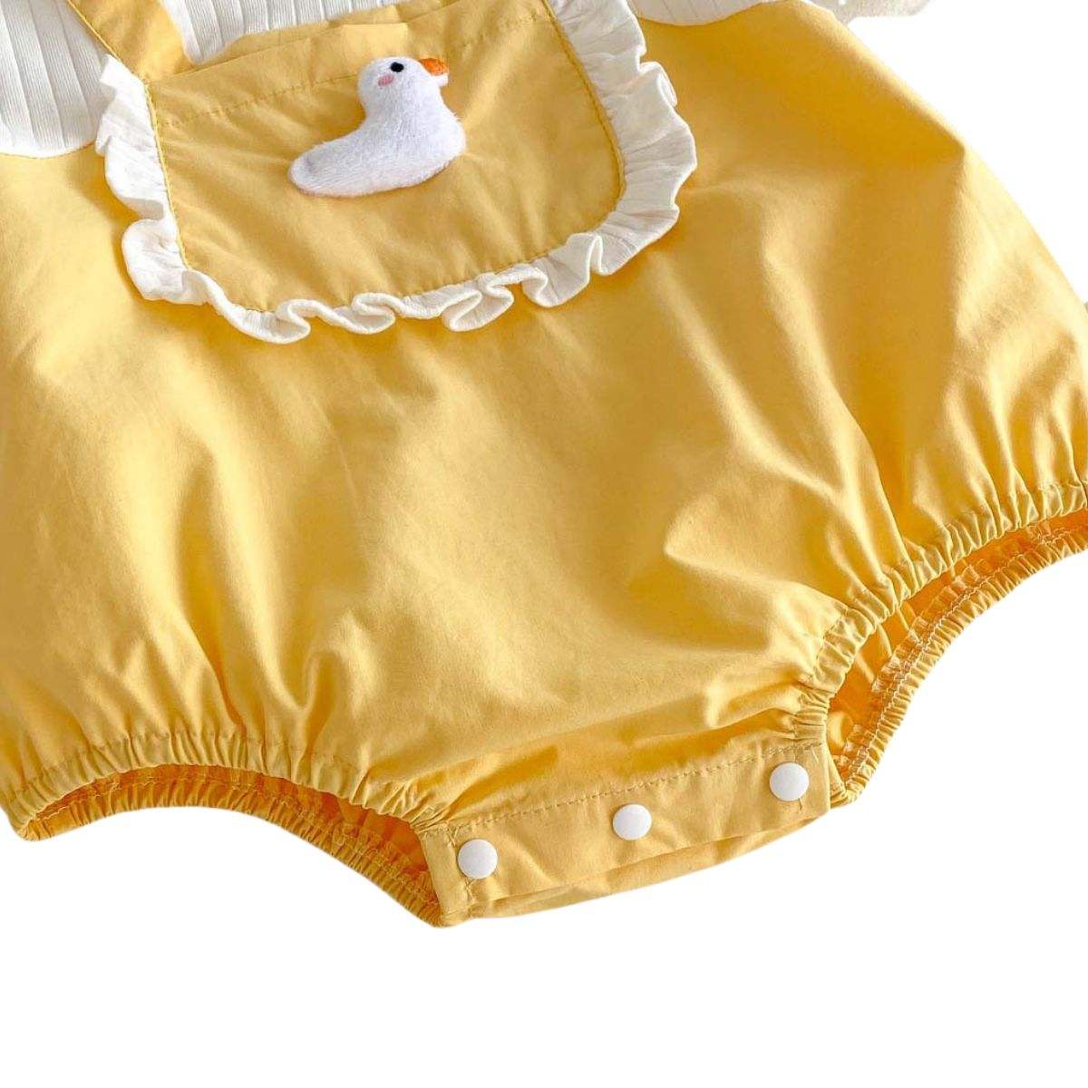 A ruffled front bib, adjustable suspender-inspired straps, and a plush duck appliqué bring extra character and charm. Designed with babies in mind, it includes stretchy leg openings and easy snap closures for effortless nappy changes.